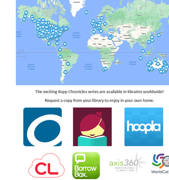 The "Kopp Chronicles" are available in over 28,000+ libraries worldwide in the USA, Canada, United Kingdom, Ireland, Europe, Australia, Hong Kong and more including the following: Redbridge Libraries, London Libraries Consortium and Manchester Libraries, UK; New York Public Library, Brooklyn Public Libraries, Westchester Library System, NY; Jersey City Free Public Library, Hackensack Public Library, Bergen County Public Libraries, New Jersey Pima County Library, AZ; Hounslow Library, UK, Los Angeles, San Diego and San Francisco Public Libraries, CA; Orange County CA Public Libraries, Evansville Vanderburgh Public Library, IN; Anchorage Public library, AK; Lincoln (Springfield), Chicago, Morton Grove and Naperville Public Libraries, IL; Boston Public Library, MA; Cincinnati, Cleveland and Dayton Public Libraries, OH; Miami-Dade Public Library, Tampa and Jacksonville Public Libraries, FL, Seattle Public Library, WA; Dallas and Harris County Libraries, TX; Markham Public Library, Middlesex County Library Ontario, Canada, Vancouver Public Library, British Columbia, Canada, The Regional Automation Consortium (TRAC) Alberta, Canada and more are added every day!