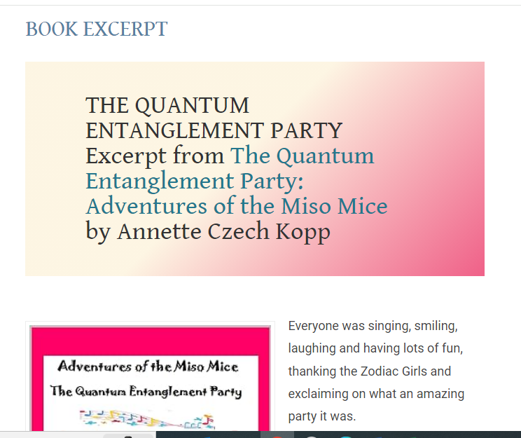 Annette Czech Kopp appears as a featured author along with š āAdventures of the Miso Miceā & š«The Quantum Entanglement Party on 01/25/24 Luna Eden Publishingās The Curious Bookshelf https://thecuriousbookshelf.co.uk/annette-czech-kopp